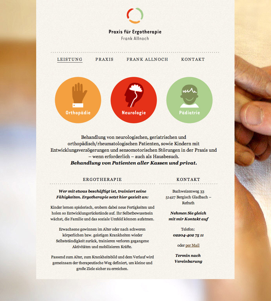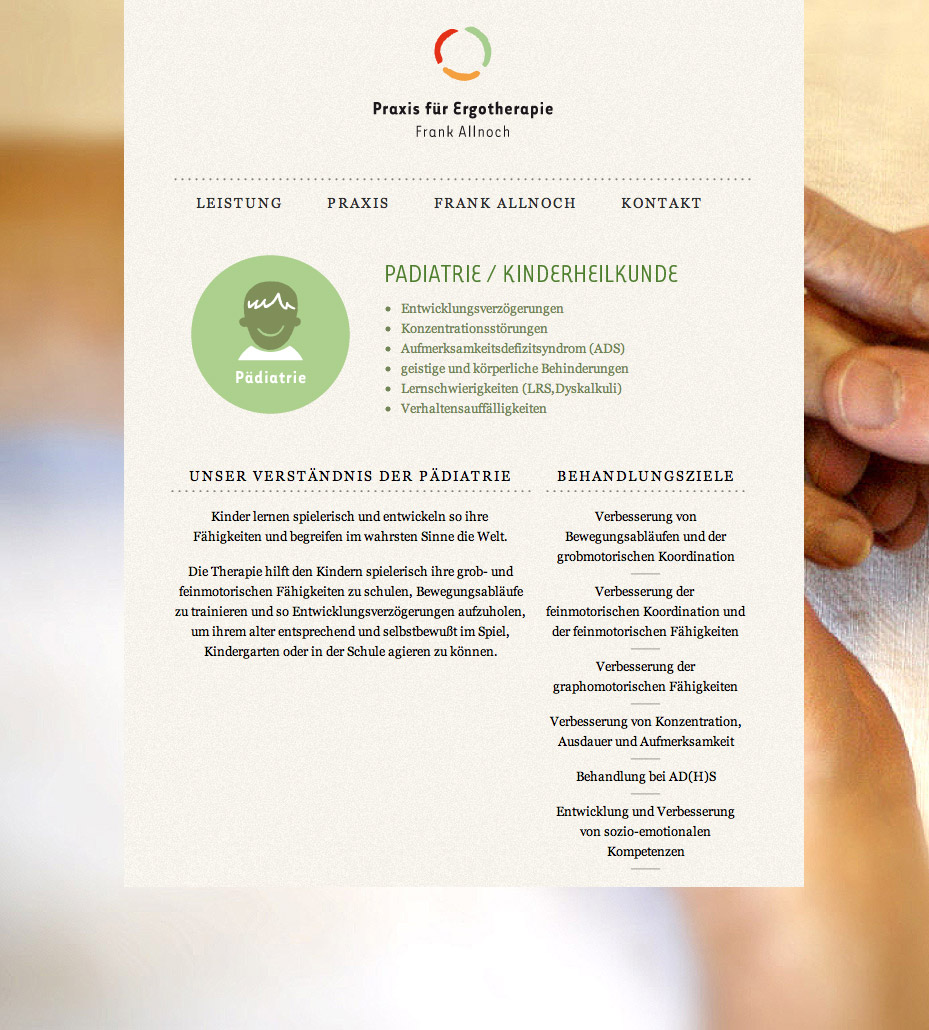 | 12 | Webseitengestaltung und Umsetzung | Screendesign für die Praxis für Ergoetherapie | Corporate Design, Webdesign | für Frank Allnoch, Refrath | |