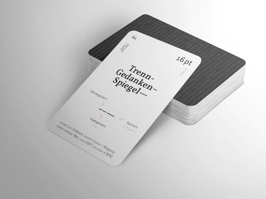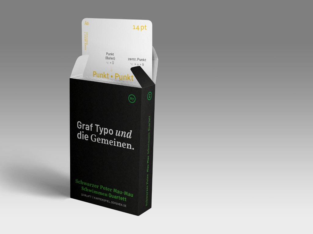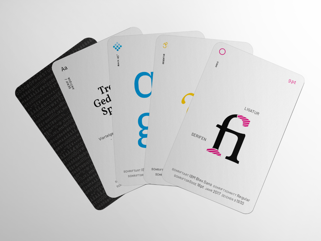 | 1 | Typografisches Kartenspiel | Ein Kartendeck kombiniert Typografie und 4 Kartenspiele | Spielkarten, Typografie | privat | |